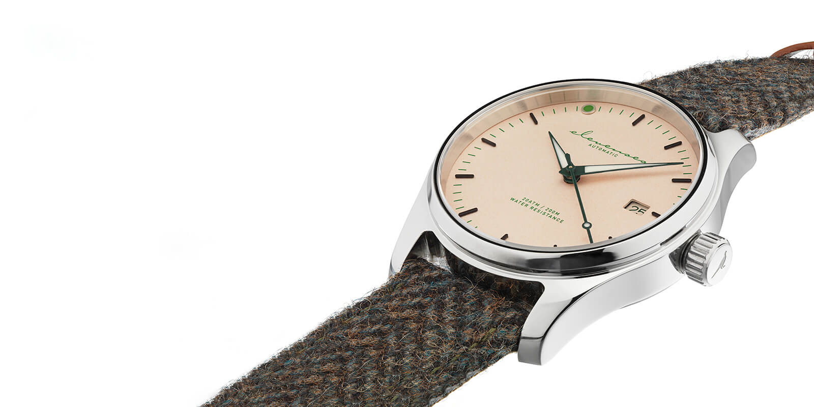 A champagne colored dial, and the slightly raised 11 o’clock marker is obvious references to the tradition of enjoying Elevenses. Sporting green details on markers, hands and date refers to the grand heritage of game shooting. The authentic Italian leather backed Harris Tweed strap is yet another reference to the tradition of dressing up for a shoot day.